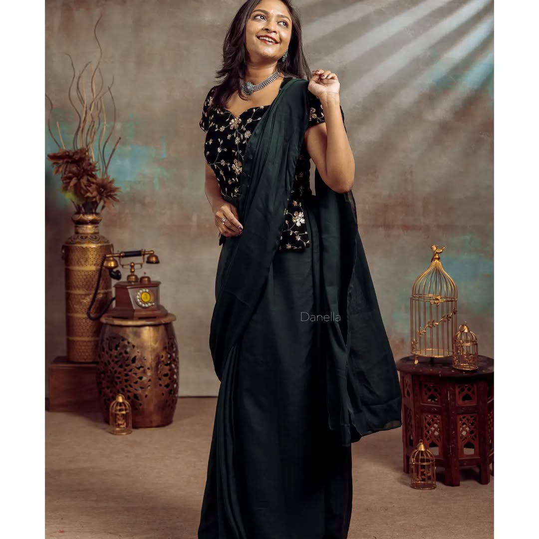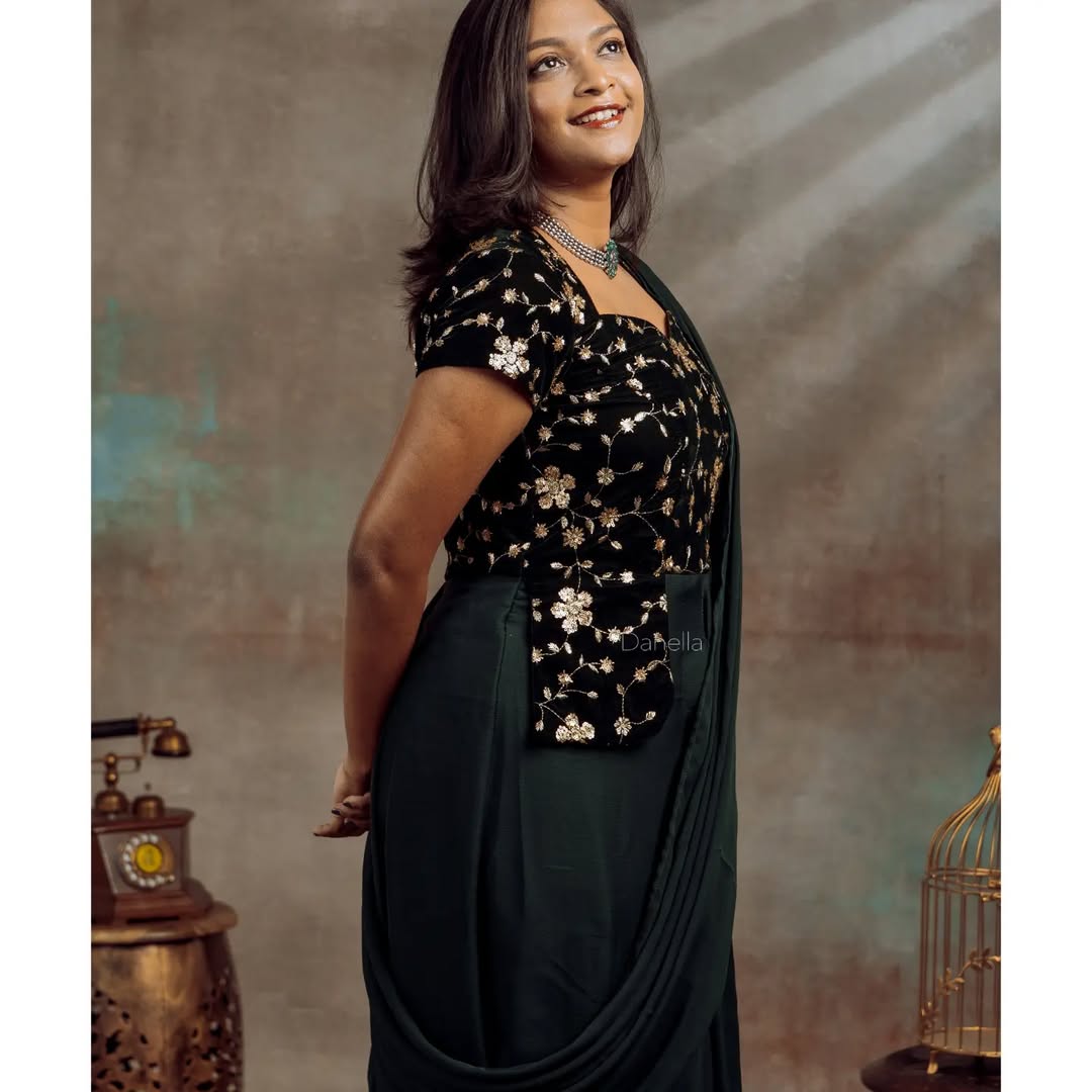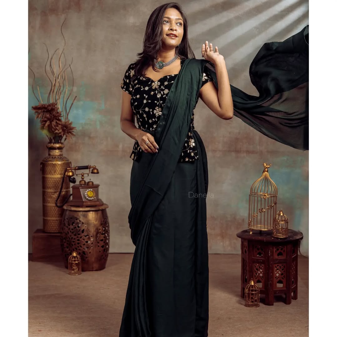 Crafted in a rich deep black hue, the saree flows gracefully, giving you a sleek and flattering silhouette. The pre-stitched drape ensures effortless wear, making it the perfect choice for weddings, receptions, or evening parties where you want to look stunning without spending hours styling.
