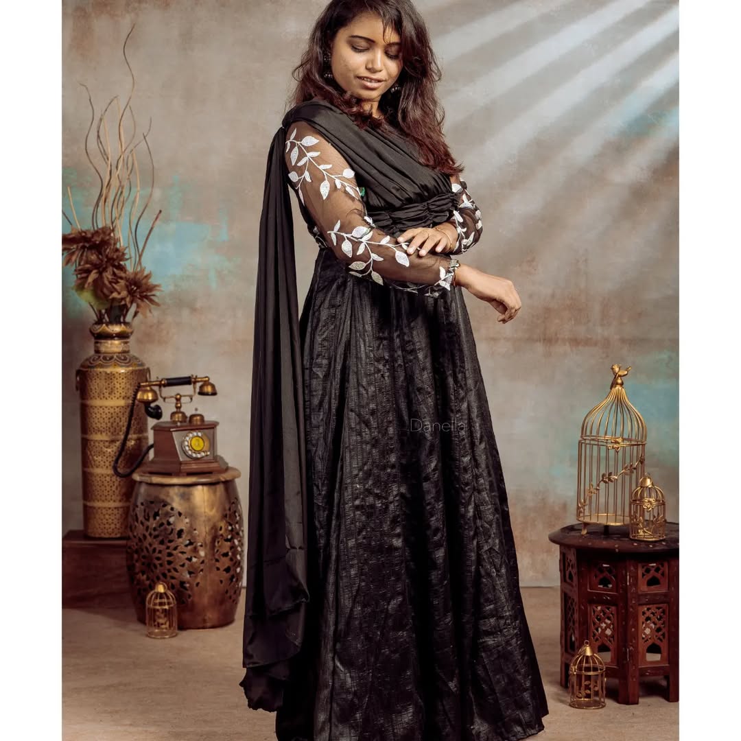 Unlike traditional gowns, the pre-stitched drape flows gracefully across the shoulders and waist, giving you the charm of a saree with the ease of a gown. It enhances the overall look while ensuring you don’t have to worry about draping or pleating.