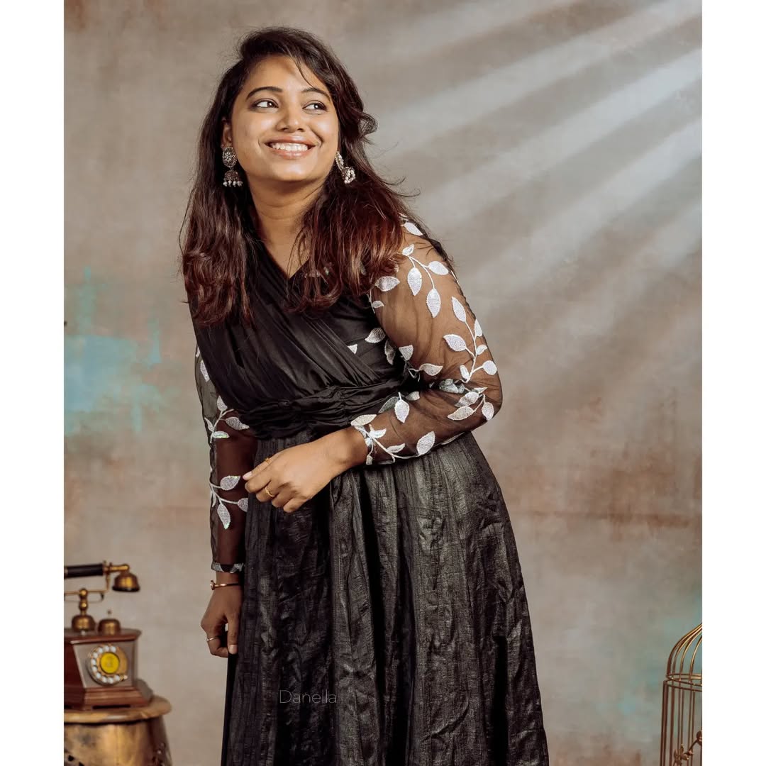 Crafted from premium fabric in a deep black shade, this gown exudes understated glamour. The highlight lies in the sheer net sleeves adorned with delicate white floral embroidery, which adds a feminine touch while balancing boldness with elegance.