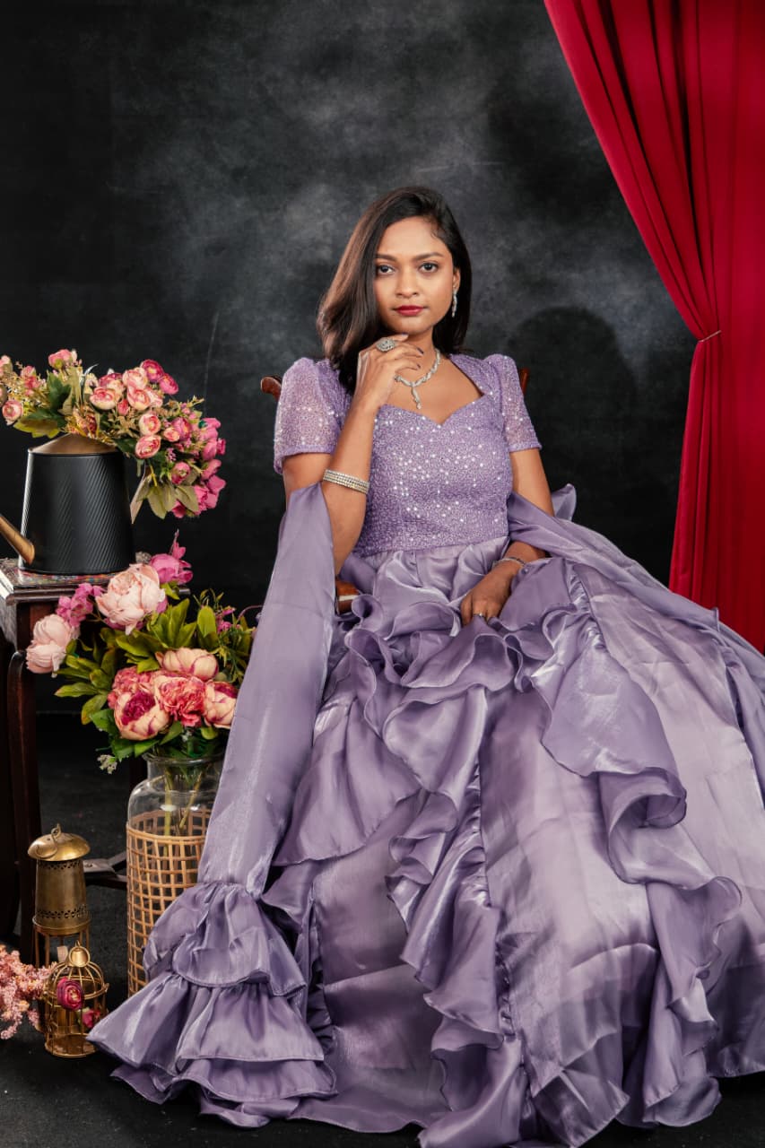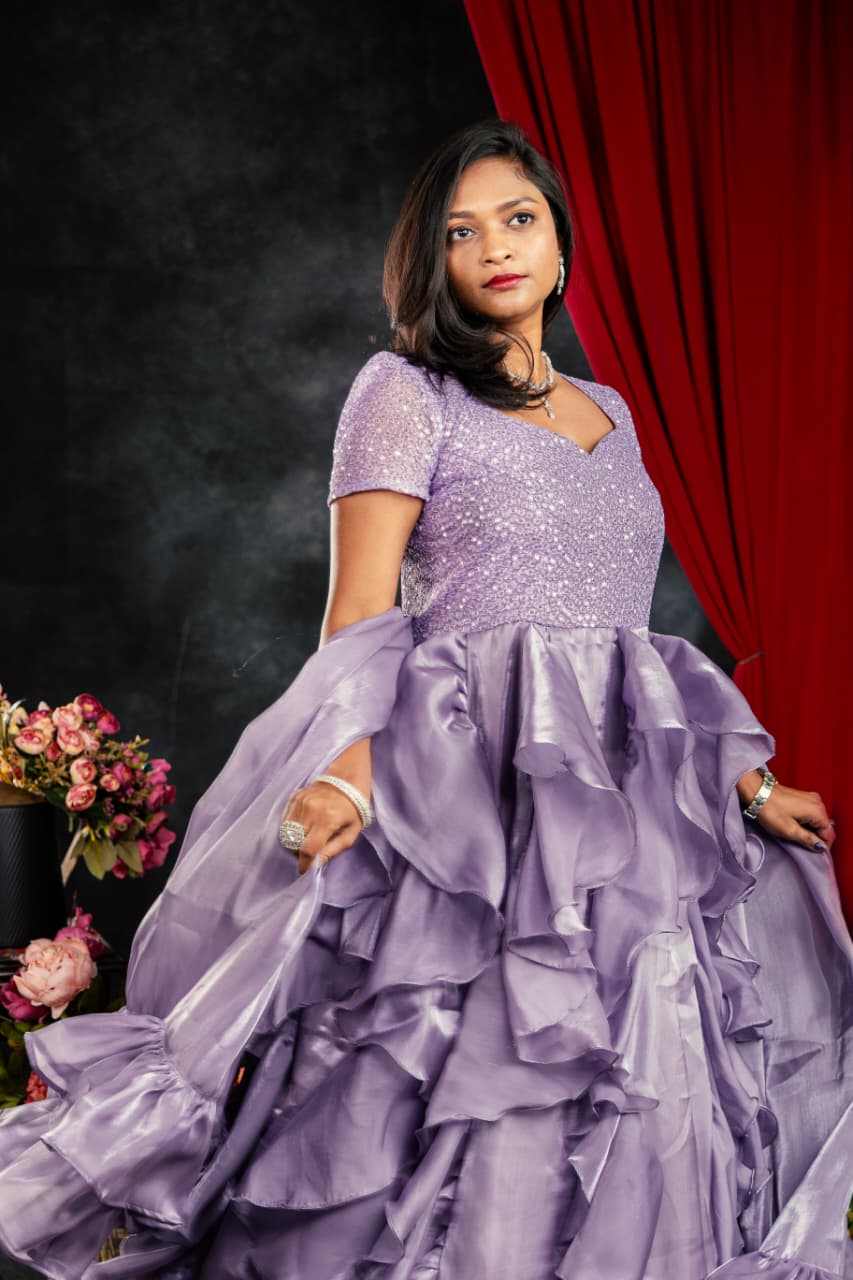 Perfect for women who want to blend sparkle with sophistication, this designer lavender gown with ruffles is your go-to outfit for making grand entrances.
